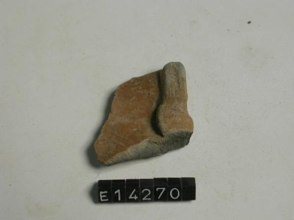 Frammento di parete di recipiente con attacco dell'ansa a nastro verticale.