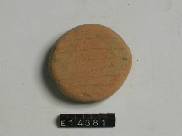 Rondella ricavata da mortaio: sulla superficie interna ci sono inclusi di grosse dimensioni, mentre la superficie esterna è attraversata da solcature parallele.