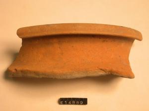 Frammento di olla con alto labbro diritto, orlo ribattuto e costolature interne sul collo