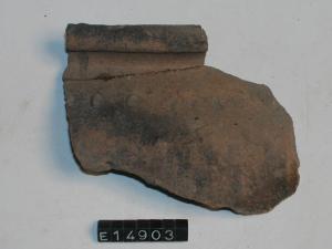 Frammento di orlo e parete di olla con orlo arrotondato esoverso, decorato a piccole tacche impresse sulla spalla.
