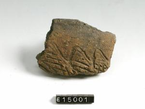 Frammento di orlo e parete di olla con orlo arrotondato, decorata sulla spalla a incisioni ondulate subtriangolari e oblique a pettine
