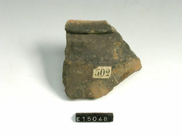 Frammento di orlo e parete di recipiente con orlo esoverso ribattuto e spalla appena accennata.