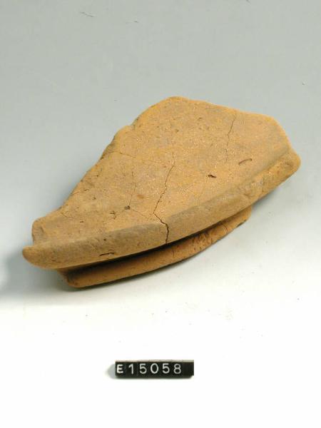 Frammento di grande scodella con orlo fortemente es9overso, sorta di tesa lungo la spalla ripiegata esternamente.