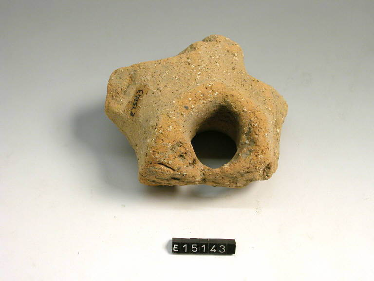 Elemento di terracotta di forma stellata forato al centro.
