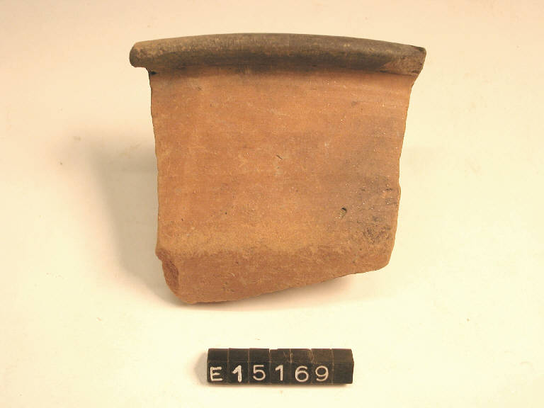 Frammento di orlo e parete di recipiente con orlo estroflesso arrotondato e spalla carenata.
