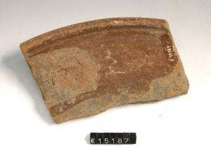 Frammento di recipiente di forma aperta (piatto?) con orlo arrotondato; dipintura interna ed esterna.