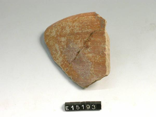 Frammento di ciotola a labbro rientrante; superficie interna ed esterna con vernice rosso corallina.