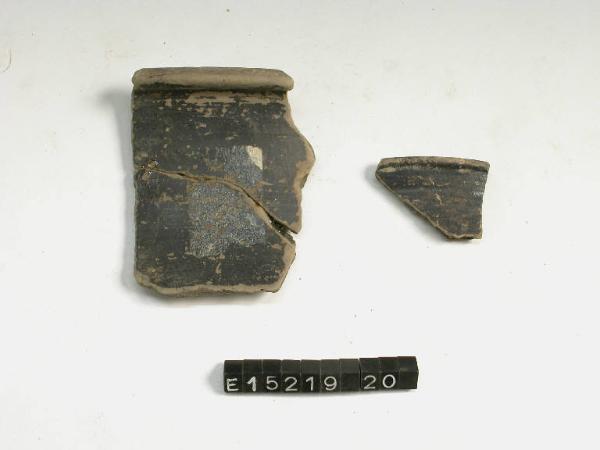 Frammento di orlo e parete pertinente a bicchiere con alto labbro svasato e orlo cordonato. Superficie lucidata esternamente ed internamente.