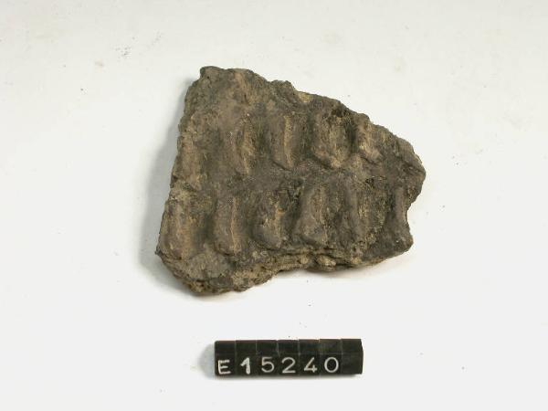 Frammento di parete pertinente a grossa olla decorata da un motivo ad alveare realizzato con tecnica a grosse unghiate regolari.