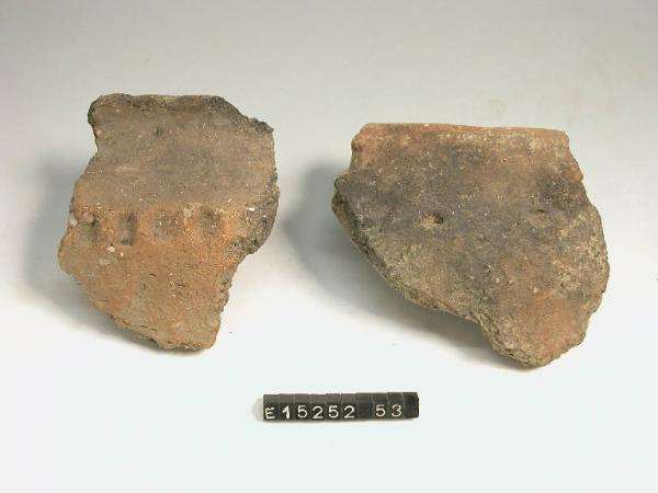 Frammento di orlo e parete pertinente a olla. Sulla superficie esterna si rileva una fascia di impressioni a ditate.