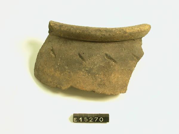 Olla ovoide con labbro indistinto esoverso decorato da fila di tacche oblique ad impressione.