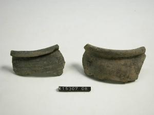 Frammento di orlo e parete pertinente ad olla. Orlo arrotondato ribattuto. Sotto la gola costolatura orizzontale.