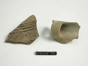 Frammenti pertinenti a mortaio con solchi dovuti alla lavorazione al tornio presenti sulla superficie esterna.