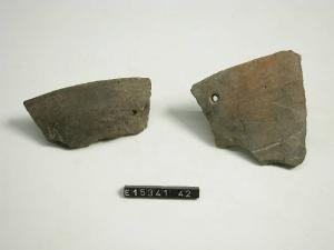 Frammento di coperchio con orlo piatto e foro passante.