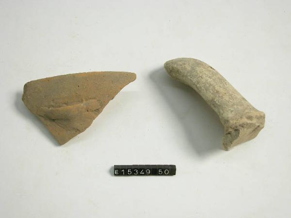 Frammento di orlo e parete pertinente a recipiente con orlo obliquo all'interno; presa lunata con superficie concava nella parte superiore.