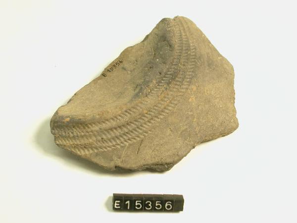 Frammento di fondo concavo pertinente ad urna. Si conserva anche un breve avvio della parete sulla quale è presente un motivo decorativo costituito da tre linee orizzontali a falsa cordicella.