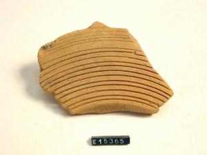 Frammento pertinente a mortaio; sulla superficie esterna sono visibili i solchi dovuti alla lavorazione al tornio.