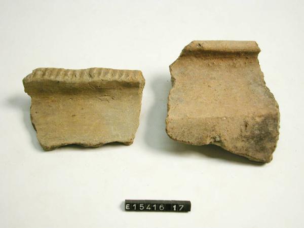 Recipiente con orlo obliquo decorato nella parte esterna a tacche pure oblique, labbro esoverso.