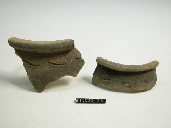 Orlo ingrossato aggettante verso l'esterno, sotto la gola motivo ad incisione costituito da serie di tacche oblique.