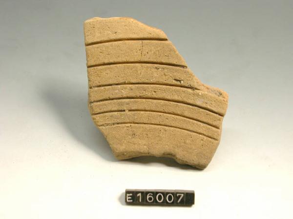 Frammento pertinente a mortaio con tracce evidenti della lavorazione al tornio sulla superficie esterna.