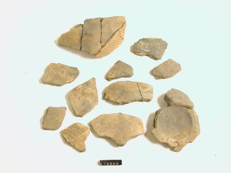 Ceramica semidepurata forse pertinenti ad un unico vaso biconico con orlo arrotondato, fondo concavo e sulla parte inferiore della superficie motivo costituito da serie continua di solcature oblique.