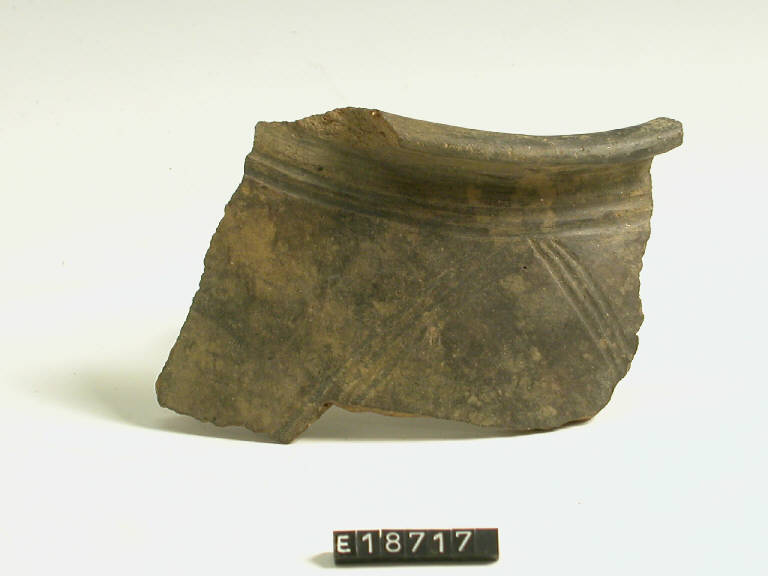 Frammento di orlo e parete di urna decorata da solcature parallele, orizzontali e a zig-zag.
