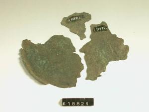Frammenti pertinenti a recipiente in lamina bronzea.