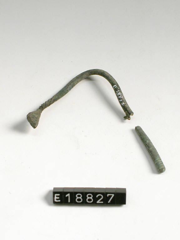 Fibula ad arco semplice decorata da solcature trasversali ; arco ritorto in corrispondenza della parte sopra la staffa.