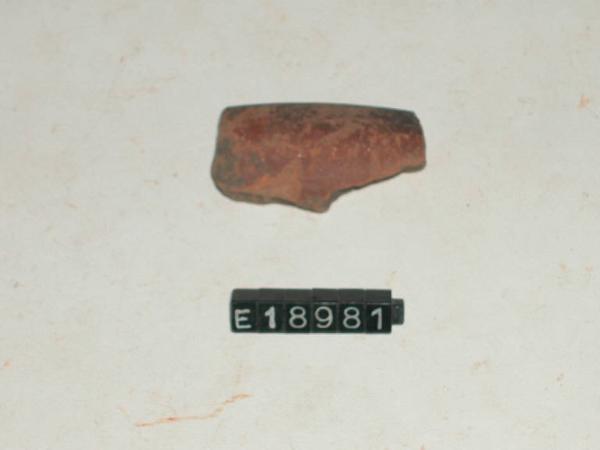 Frammento di orlo pertinente a ciotola con orlo arrotondato rientrante e superficie esterna di colore rosso-corallino..