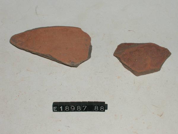 Frammenti pertinenti a ciotola con superficie esterna di colore rosso-corallino.