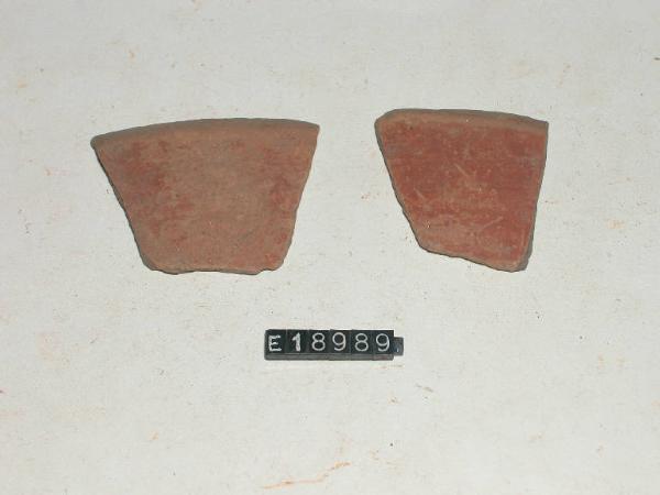 Frammenti pertinenti a ciotola con superficie esterna di colore rosso-corallino.