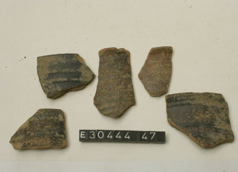 Frammento di orlo assottigliato esoverso e parete costolata di bicchiere a risega mediana tipo B o C1, con superficie a stralucido