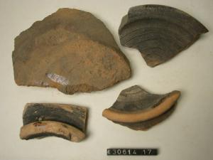 Frammento di mortaio con piede ad anello. Superficie esterna annerita, percorsa da solchi paralleli