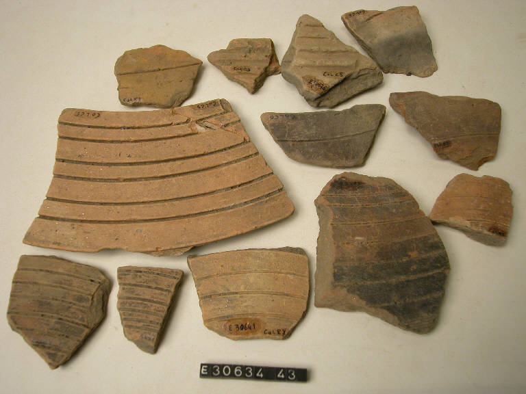 Frammento di parete di mortaio attraversata da solcature e costolature