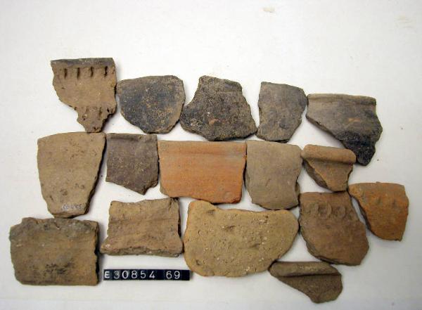 Frammento di scodella con orlo leggermente arrotondato e ispessito all'esterno.