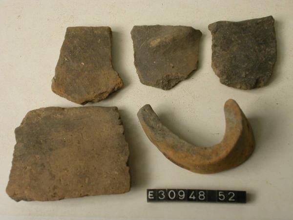 Frammento di orlo piatto leggermente scanalato e alto labbro diritto.