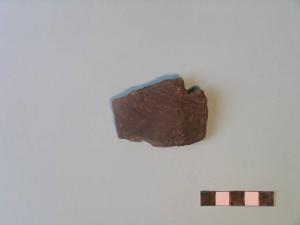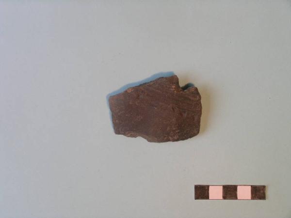 Frammento di parete con decorazione di cinque fitte solcature orizzontali, marginate da una linea di punti impressi irregolari.