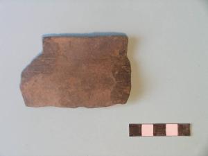 Frammento di scodellone carenato, orlo arrotondato, parete rastremata concava, decorata da tre sottili incisioni orizzontali parallele.
