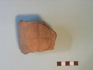 Frammento di carena di vaso biconico, decorato sulla parete da un cerchio rilevato con solcature disposte a croce.