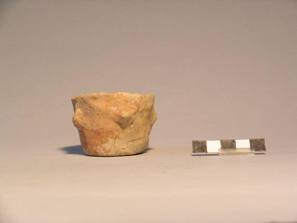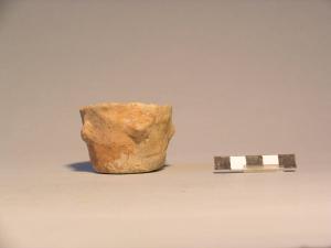 Vasetto miniaturistico, dal profilo troncoconico, orlo a impressioni digitali, fondo piatto; sotto l'orlo quattro bugnette coniche.