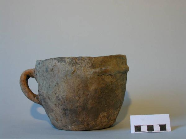 Boccale troncoconico, orlo piatto, parete leggermente convessa, fondo piatto; sotto l'orlo è impostata un'ansa a nastro e, opposto a essa, un cordone plastico orizzontale lungo 18 cm.