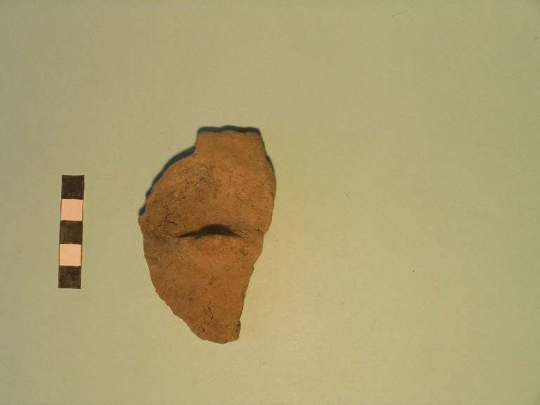 Frammento di vaso troncoconico, orlo piatto digitato, parete a profilo leggermente convesso su cui è applicata una presa a linguetta orizzontale.