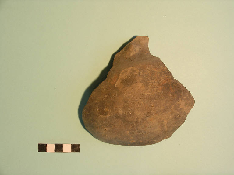 Frammento di vaso a profilo globoso, orlo assottigliato, labbro esoverso, breve parete rastremata, spalla arrotondata, vasca emisferica, al di sotto dell'orlo è applicata una bugnetta conica.
