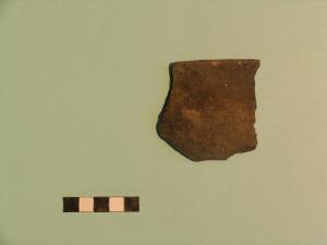 Frammento di scodella carenata, orlo arrotondato, labbro leggermente esoverso, parete verticale concava, carena arrotondata, vasca a profilo convesso.