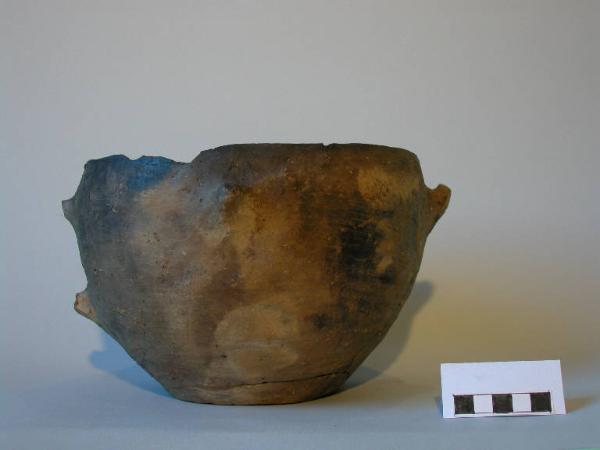 Vaso ovoide, orlo e fondo piatto; al di sotto dell'orlo è impostata un'ansa, di cui restano gli attacchi; lungo il diametro massimo, a breve distanza dall'orlo, tre bugnette coniche.