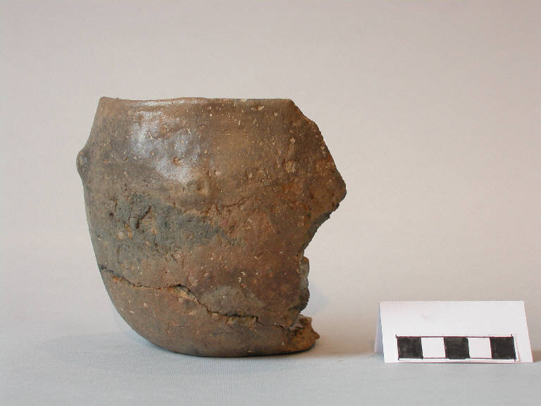 Vaso troncoconico frammentario, orlo arrotondato, parete leggermente convessa, fondo piatto; a circa 3 cm dall'orlo sono applicate due bugnette appiattite.