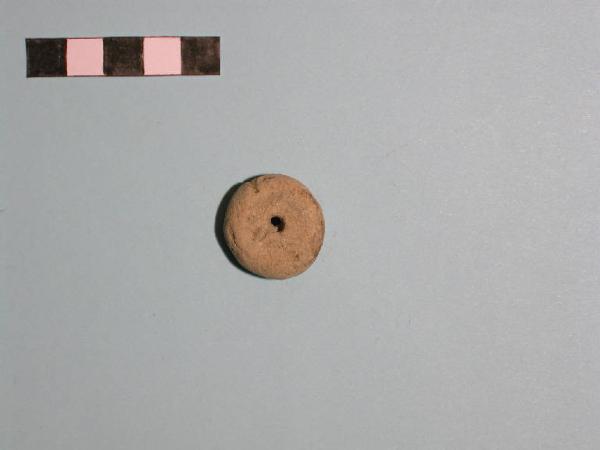 Fuseruola a corpo globoso, base piana, foro leggermente eccentrico.
