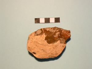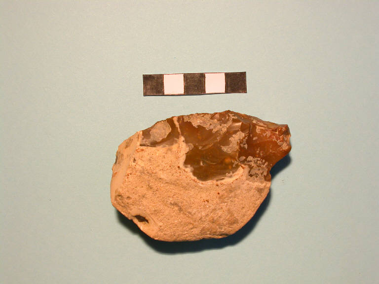 Porzione di ciottolo di selce con stacchi irregolari; conserva buona parte del cortice.