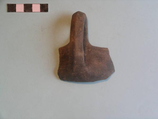 Frammento di tazza carenata, orlo arrotondato, parete svasata rettilinea, carena arrotondata; tra orlo e carena è impostata un'ansa sopraelevata a bastoncello a sezione poligonale; sulla carena fila di piccoli punti impressi.