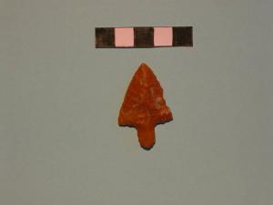 Punta di freccia peduncolata foliata, con ritocco piatto, bifacciale, coprente; la punta ha bordi rettilinei, spalle orizzontali e peduncolo a lati paralleli con base arrotondata; sezione convessa.